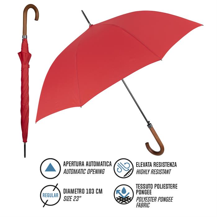 Ombrello pieghevole 22'' antivento con fusto in fibra di vetro, apertura automatica, impugnatura curva in legno, tessuto in microfibra. Diametro 104 cm